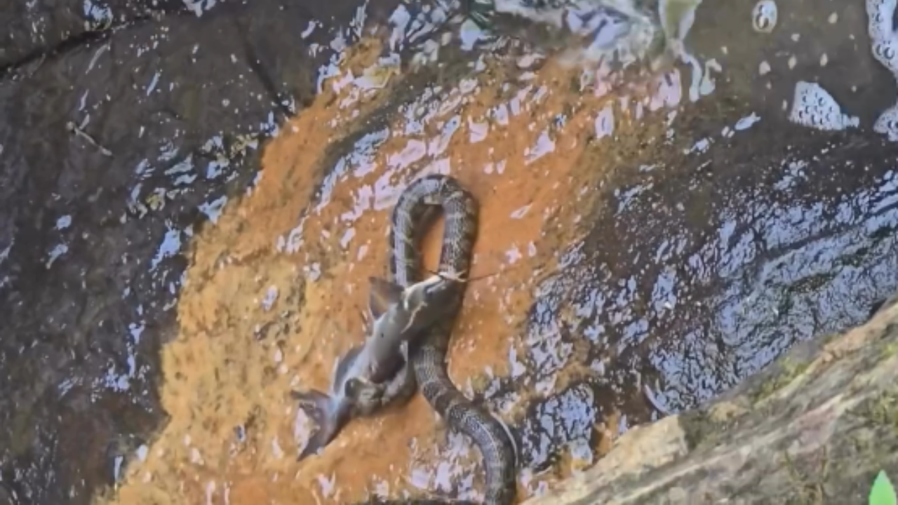 - Vídeo mostra cobra pescando peixe na margem do rio, comportamento natural de algumas serpentes aquáticas que caçam peixes com agilidade usando mandíbulas adaptadas para engolir presas maiores que a cabeça.