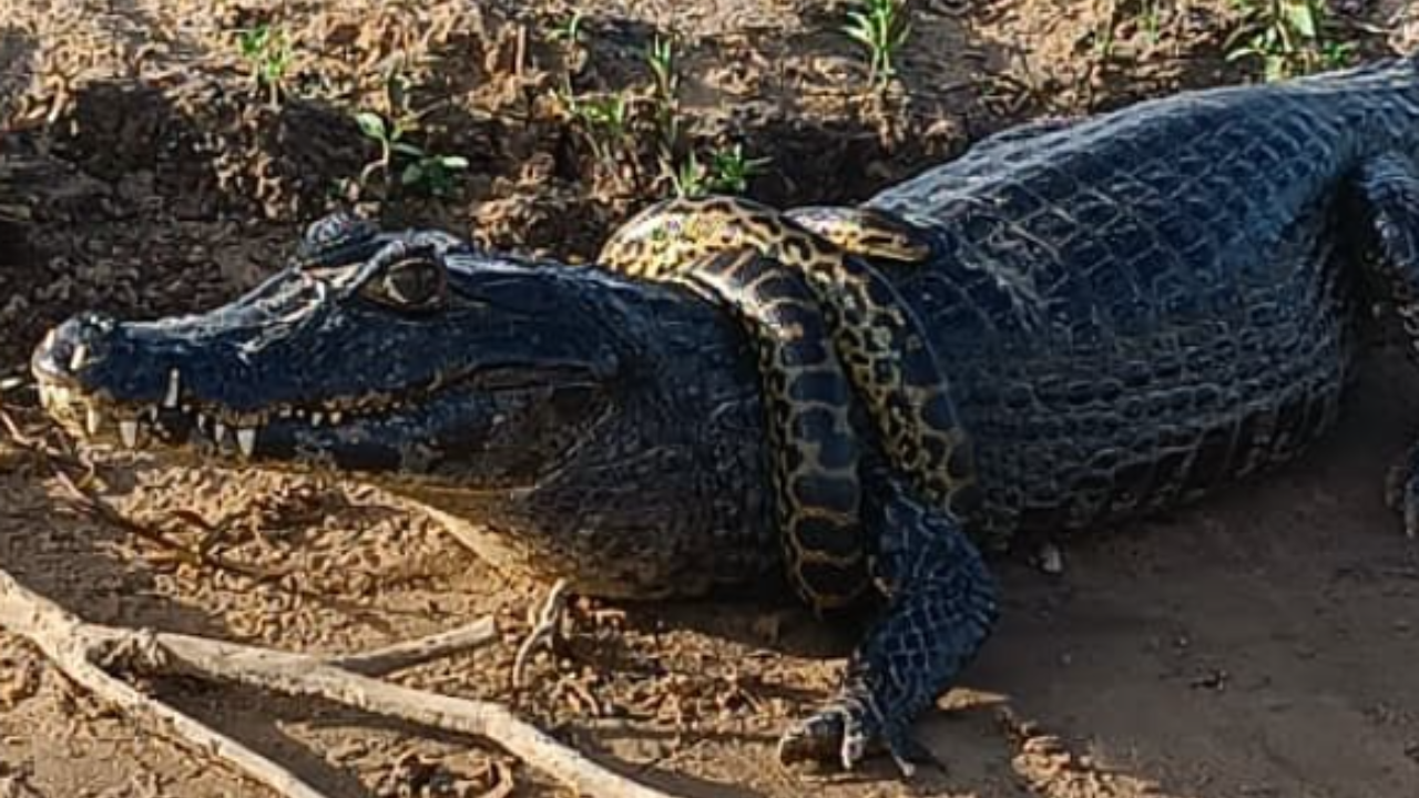 Um vídeo gravado no Pantanal tem chamado atenção nas redes sociais ao mostrar uma cena inusitada: uma sucuri amarela jovem enrolada no pescoço de um jacaré, como se fosse um “cachecol”. O registro, que rapidamente se tornou viral, mostra o réptil caminhando tranquilamente pela margem do rio com a cobra ao redor do pescoço.