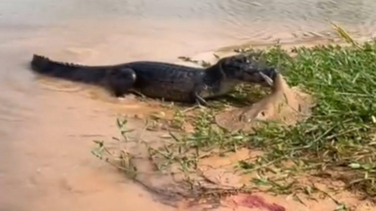 A cena, gravada em vídeo, mostra o jacaré desferindo mordidas contra a arraia, que reage com ferroadas, mas acaba sendo vencida após uma breve luta. O confronto durou apenas alguns instantes, mas foi suficiente para impressionar os pescadores presentes.