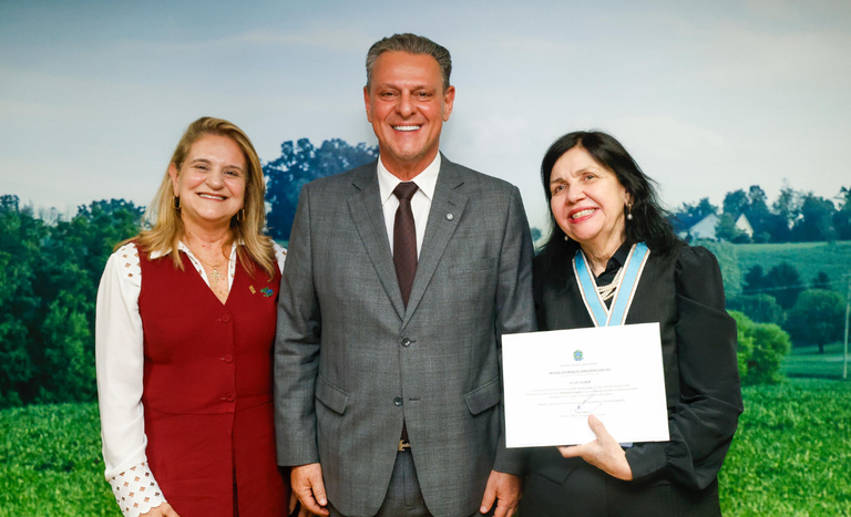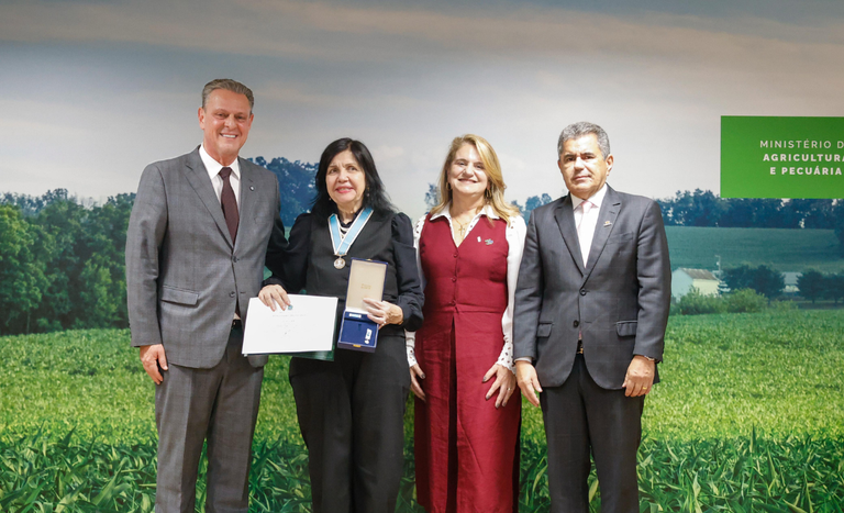 - O ministro Carlos Fávaro entregou a Medalha de Mérito Apolônio Salles à pesquisadora Mariangela Hungria, reconhecendo seus mais de 40 anos de dedicação à agricultura sustentável e avanços em bioinsumos no Brasil.