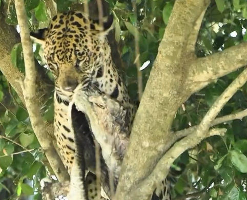 Na manhã da última quarta-feira (23/10/25), o guia e fotógrafo Bruno Jacob documentou um comportamento extraordinário no Parque Estadual Encontro das Águas (MT): a onça-pintada Jaju, uma fêmea conhecida na região, escalou uma árvore carregando a carcaça de um jacaré. Especialistas consideram o registro possivelmente inédito para a espécie.