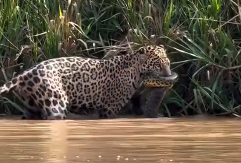 O encontro começou com uma breve e intensa disputa. A onça, utilizando sua força e agilidade, aplicou uma técnica de predação precisa na serpente. Após dominar completamente a sucuri, a onça-pintada segurou firmemente a presa em suas poderosas mandíbulas e transportou o corpo da serpente para o interior da mata.