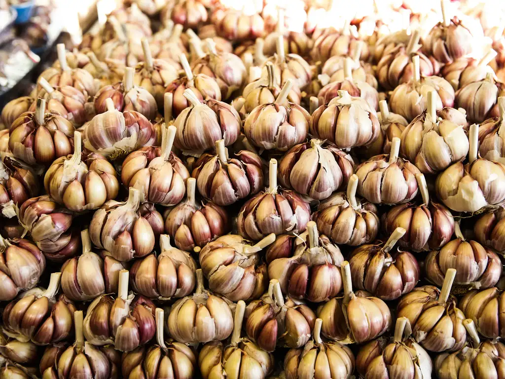 O alho brasileiro costuma ter a casca branca ou com um arroxo leve. Quase tímido. Mas, quando você abre, a pele dos dentes brilha num roxo mais firme. Os dentes são compactos. Apertados mesmo. A cabeça pesa mais na mão. Dá uma sensação de produto forte, inteiro.