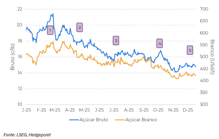 O mercado de açúcar registrou tendência baixista em 2025. O Centro-Sul brasileiro apresentou bons resultados de moagem com mix açucareiro elevado, gerando produção robusta. No Hemisfério Norte, perspectivas positivas de produção reforçaram o sentimento de baixa.