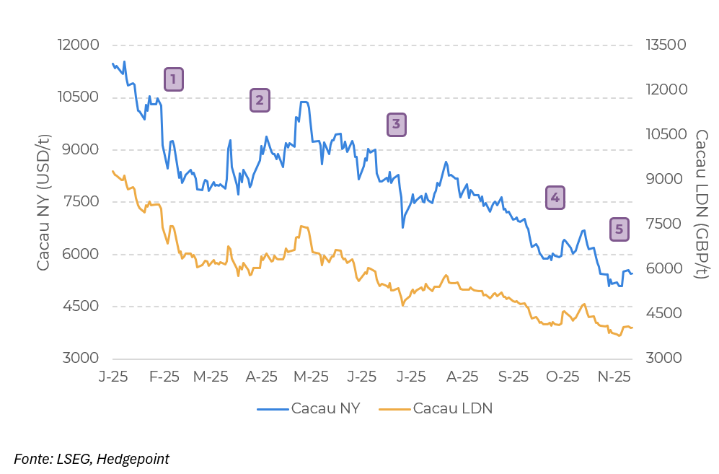 - No açúcar, o clima brasileiro e decisões da Índia sobre exportações serão cruciais; no cacau, a oferta na África Ocidental segue incerta, mantendo a volatilidade e preços elevados.