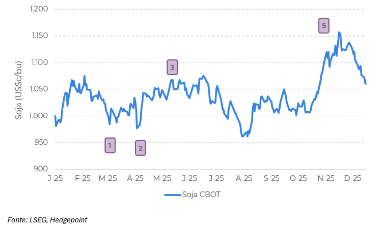 “A dinâmica do complexo soja em 2026 vai depender especialmente de três engrenagens: China, biodiesel nos EUA e clima na América do Sul e EUA. O timing de cada uma pode trazer um ambiente diferente da lateralidade registrada na maior parte de 2025”, diz Luiz Roque, coordenador de Inteligência de Mercado da Hedgepoint.