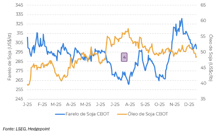 O complexo soja (grão, farelo e óleo) registrou mercado lateralizado em 2025 por forças opostas de oferta e demanda. Safra recorde na América do Sul contrastou com tendência de safra menor nos EUA. A menor demanda pela soja americana durante a guerra comercial competiu com o crescimento do esmagamento e a perspectiva de aumento da mistura de biocombustíveis.