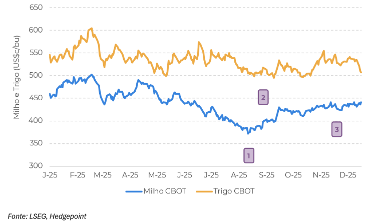 Os EUA colheram em 2025 a maior safra de milho da história, resultado de aumento de área e clima favorável. As exportações superaram expectativas pela competitividade de preço. No trigo, grandes produtores ampliaram produção, elevando a oferta global a níveis recordes.